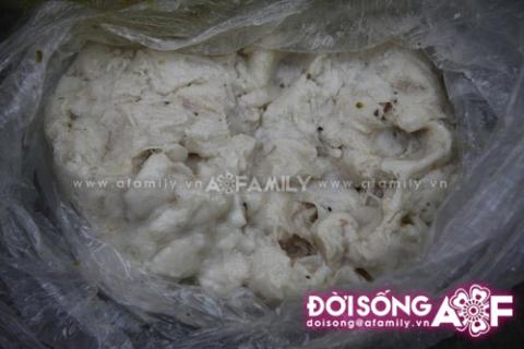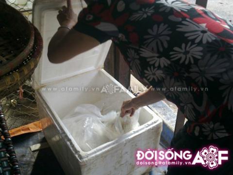 Tiếp tục khám phá con đường hoa quả thối thành những cốc sinh tố tươi ngon. Chúng tôi theo chân anh đến một sạp hàng ở giữa chợ của một tiểu thương hơn 50 tuổi, tên Nga. Không cần hỏi giá, mặc cả dài dòng, người phụ nữ to béo mở tủ lạnh, thùng xốp lấy ra hai túi nilon, một đựng thứ gì đó màu trắng đục, túi còn lại đựng thứ hỗn hợp màu xám xanh lẫn màu vàng đang chảy nước tong tỏng, đặt lên bàn cân.